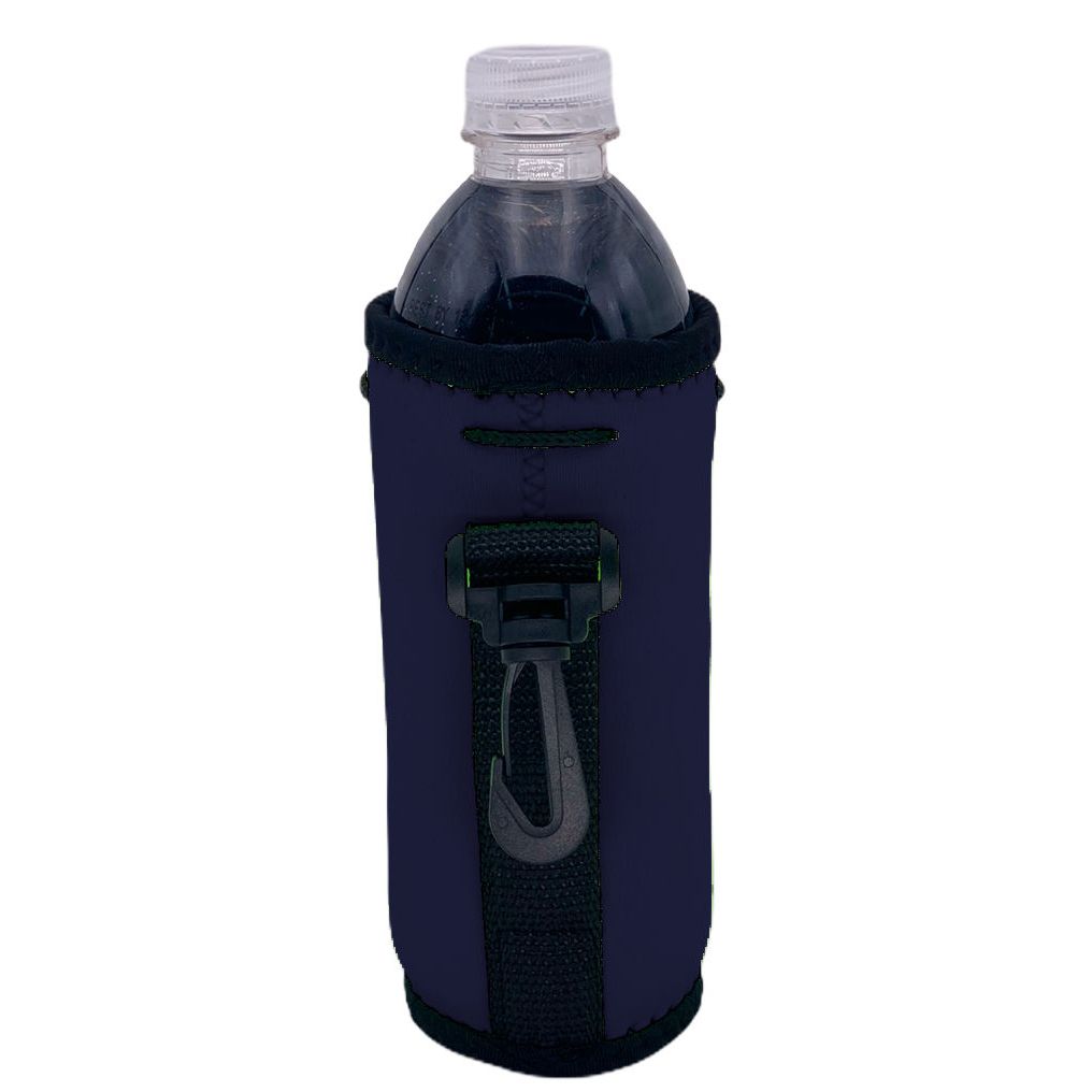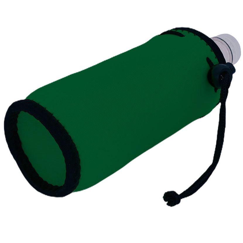 Full sewn in neoprene fabric bottom with trim. 1/8" (thickness) neoprene material. Built to fit 16/17 oz plastic disposable water bottles. Drawstring, plastic clip and nylon handle on side. Keeps drinks colder longer and hands dry. Prevents surface and table damage from condensation. Graphic is a high quality heat transfer, 1 side print.