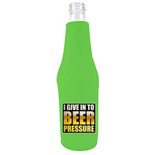 • Load image into Gallery viewer, "i give in to beer Pressure" funny design zipper bottle koozie