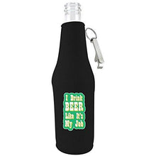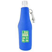 Made of 1/8" (3mm) neoprene (similar to a wet suit) material. Full glued in non-skid rubber bottom. Fits regular 12 oz long neck beer bottles. Metal bottle opener attached at zipper pull. Keeps beer colder longer and hands dry. Prevents table damage from condensation. Graphic is a durable vinyl heat transfer.
