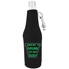 Made of 1/8" (3mm) neoprene (similar to a wet suit) material. Full glued in non-skid rubber bottom. Fits regular 12 oz long neck beer bottles. Metal bottle opener attached at zipper pull. Keeps beer colder longer and hands dry. Prevents table damage from condensation. Graphic is a durable vinyl heat transfer.