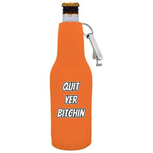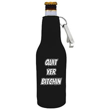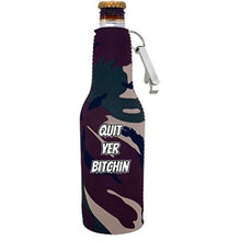 Made of 1/8" (3mm) neoprene (similar to a wet suit) material. Full glued in non-skid rubber bottom. Fits regular 12 oz long neck beer bottles. Metal bottle opener attached at zipper pull. Keeps beer colder longer and hands dry. Prevents table damage from condensation. Graphic is a durable vinyl heat transfer.