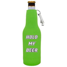 • Load image into Gallery viewer, Bright green zipper beer bottle koozie with opener and funny hold my beer design